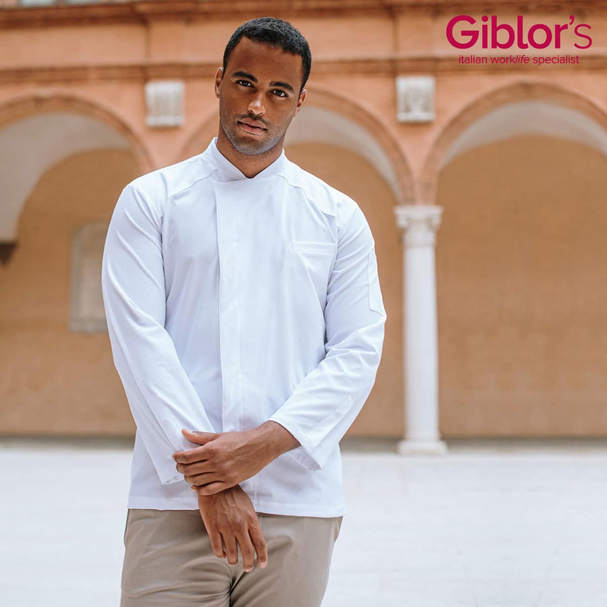 La giacca Diego di Giblor’s è pensata per chef e professionisti che desiderano un look moderno e raffinato. Realizzata in tessuto Sorona® con armatura ripstop, offre morbidezza, elasticità e alta resistenza a strappi e abrasioni. Il design con colletto coreano slim, doppia abbottonatura nascosta e dettagli curati unisce eleganza, comfort e funzionalità in un capo di alta qualità.
