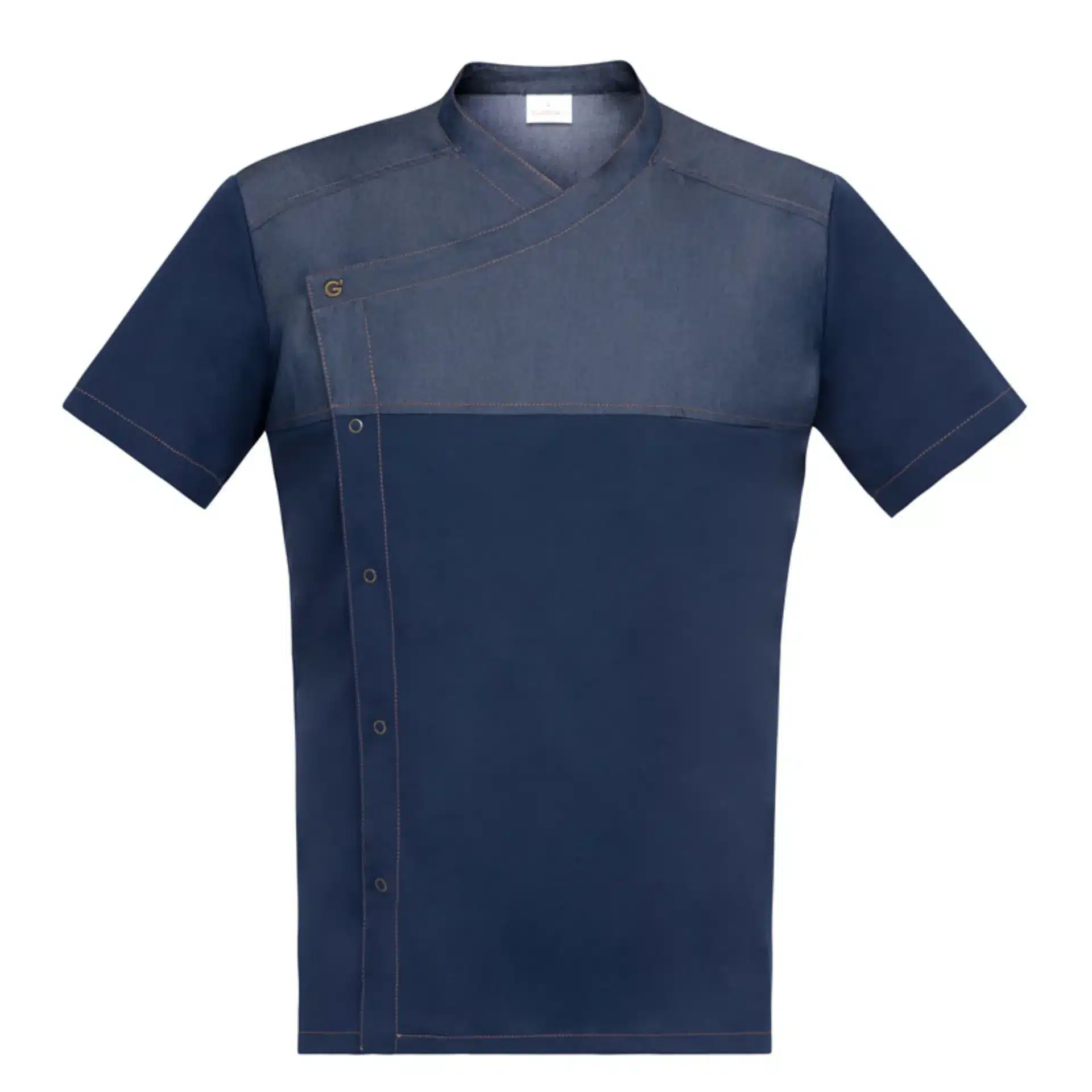 Il collo è squadrato in pieno stile francese. L’abbottonatura anteriore è arricchita da 5 automatici in galvanica di ottone anticato, il primo dei quali è siglato dall’inconfondibile logo G. Ha una vestibilità slim fit, valorizzata dalle impunture di finitura a contrasto in colore ocra. Questo dettaglio richiama la galvanica dell’abbottonatura e conferisce un carattere sportivo al capo. Due spacchi sul retro assicurano massima libertà di movimento. La casacca è dotata di un taschino sul petto. La parte superiore è realizzata in tessuto jeans misto in poliviscosa elasticizzata, che risulta morbido al tatto e garantisce comfort nella vestibilità. Il retro e le maniche sono realizzati in tessuto maglia con motivo piquet 160 gr/mtq, anch’esso molto morbido al tatto.